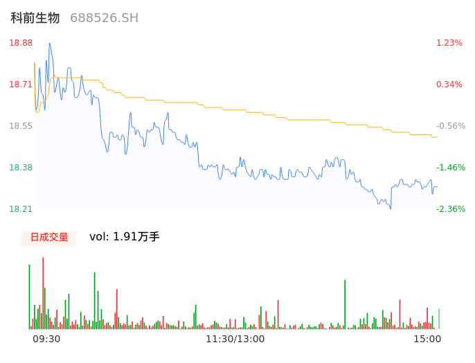 05月10日,科前生物收报18.29,股价涨幅-1.93%,成交金额3528.15万元,换手率0.41%。