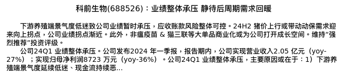 值得注意的是:2024年05月招商证券的朱卫华/施腾分析师,首次发布关于科前生物的研究报告,标题为:科前生物(688526):业绩整体承压 静待后周期需求回暖。