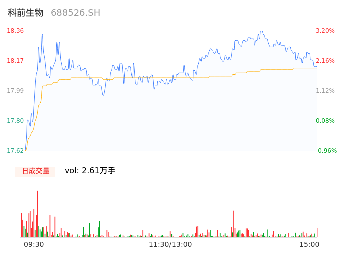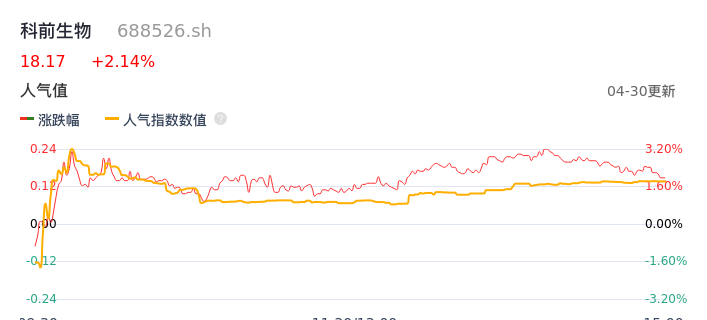 04月30日,科前生物收报18.17,股价涨幅2.14%,成交金额4732.22万元,换手率0.56%。