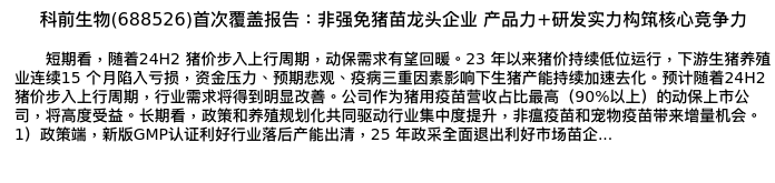 值得注意的是:2024年04月西部证券的熊航分析师,首次发布关于科前生物的研究报告,标题为:科前生物(688526)首次覆盖报告:非强免猪苗龙头企业 产品力+研发实力构筑核心竞争力。
