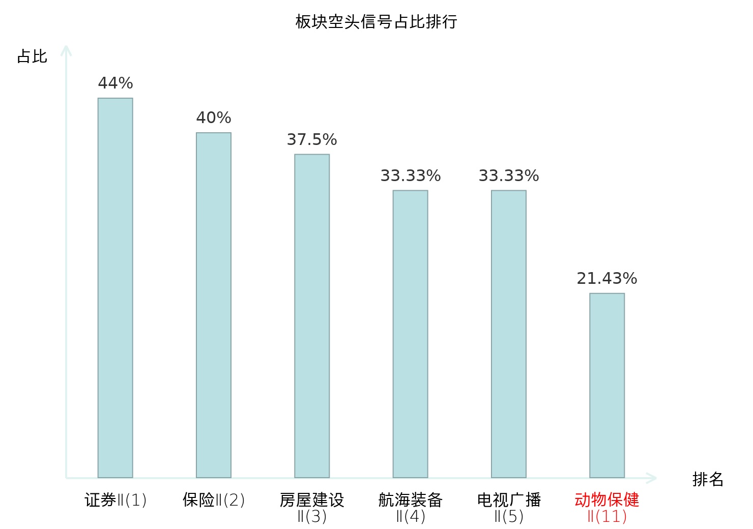 全市场所有行业板块中主力空头信号占比排名中,证券Ⅱ板块位居第一。证券Ⅱ板块名次提升最快,较昨日上升125位。