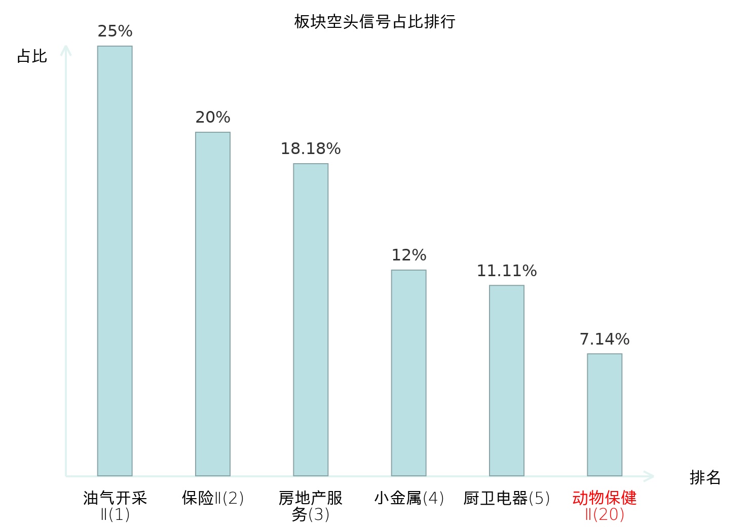 全市场所有行业板块中主力空头信号占比排名中,油气开采Ⅱ板块位居第一。装修建材板块名次提升最快,较昨日上升117位。