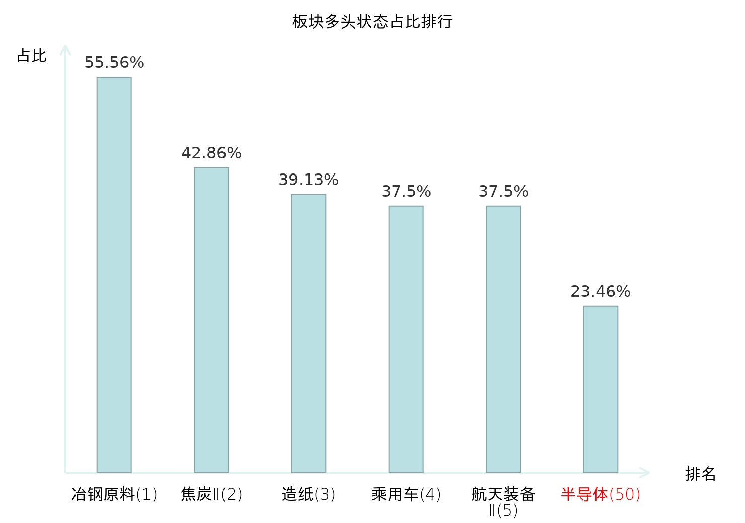 全市场所有行业板块中主力多头状态占比排名中,冶钢原料板块位居第一。房屋建设Ⅱ板块名次提升最快,较昨日上升84位。