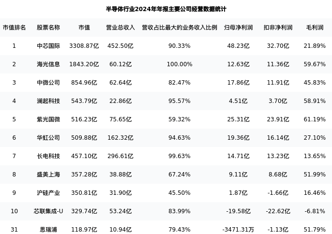 思瑞浦最新报告期数据为年报,下表汇总了半导体行业内市值靠前的公司年报主要经营数据