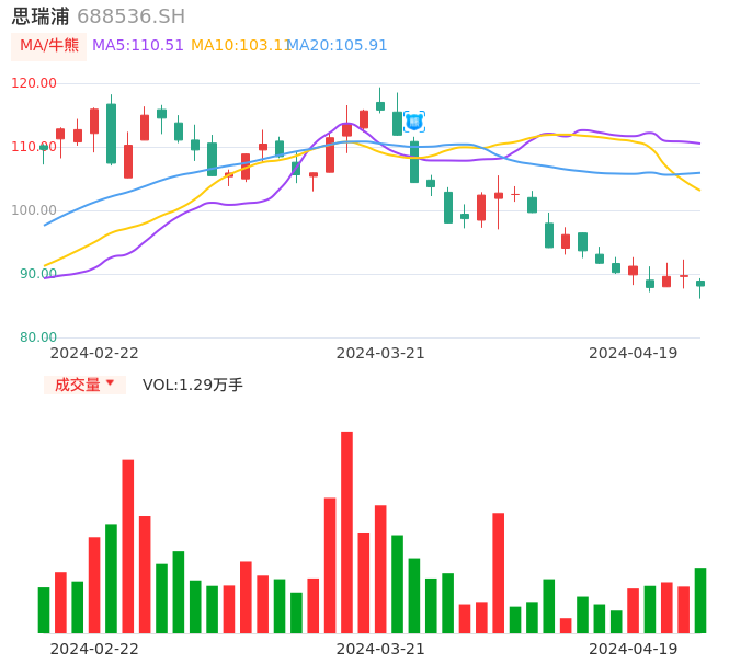 04月19日,思瑞浦收报88.10,股价涨幅-1.81%,成交金额1.13亿元,换手率1.07%。