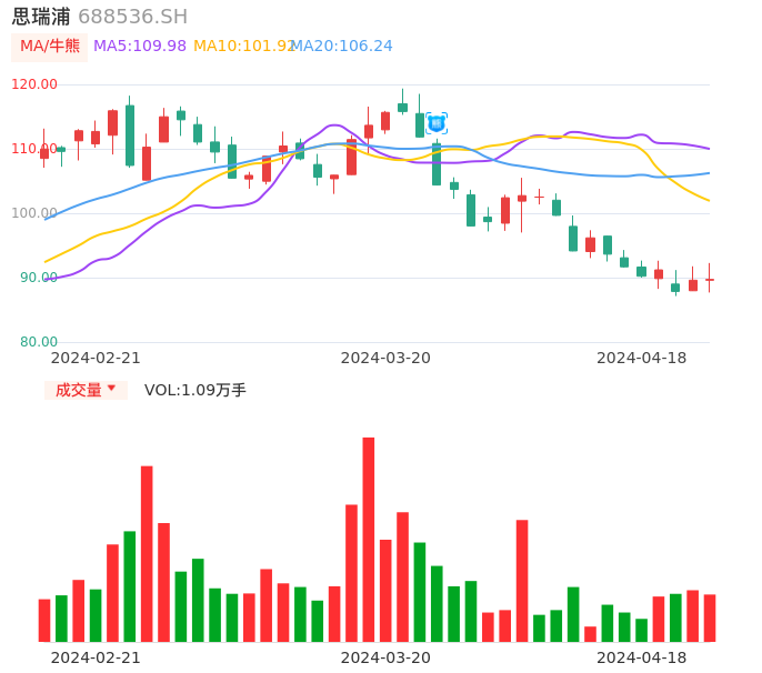 04月18日,思瑞浦收报89.72,股价涨幅0.13%,成交金额9845.51万元,换手率0.91%。
