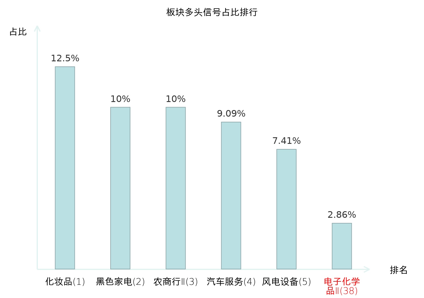 全市场所有行业板块中主力多头信号占比排名中,化妆品板块位居第一。黑色家电板块名次提升最快,较昨日上升111位。