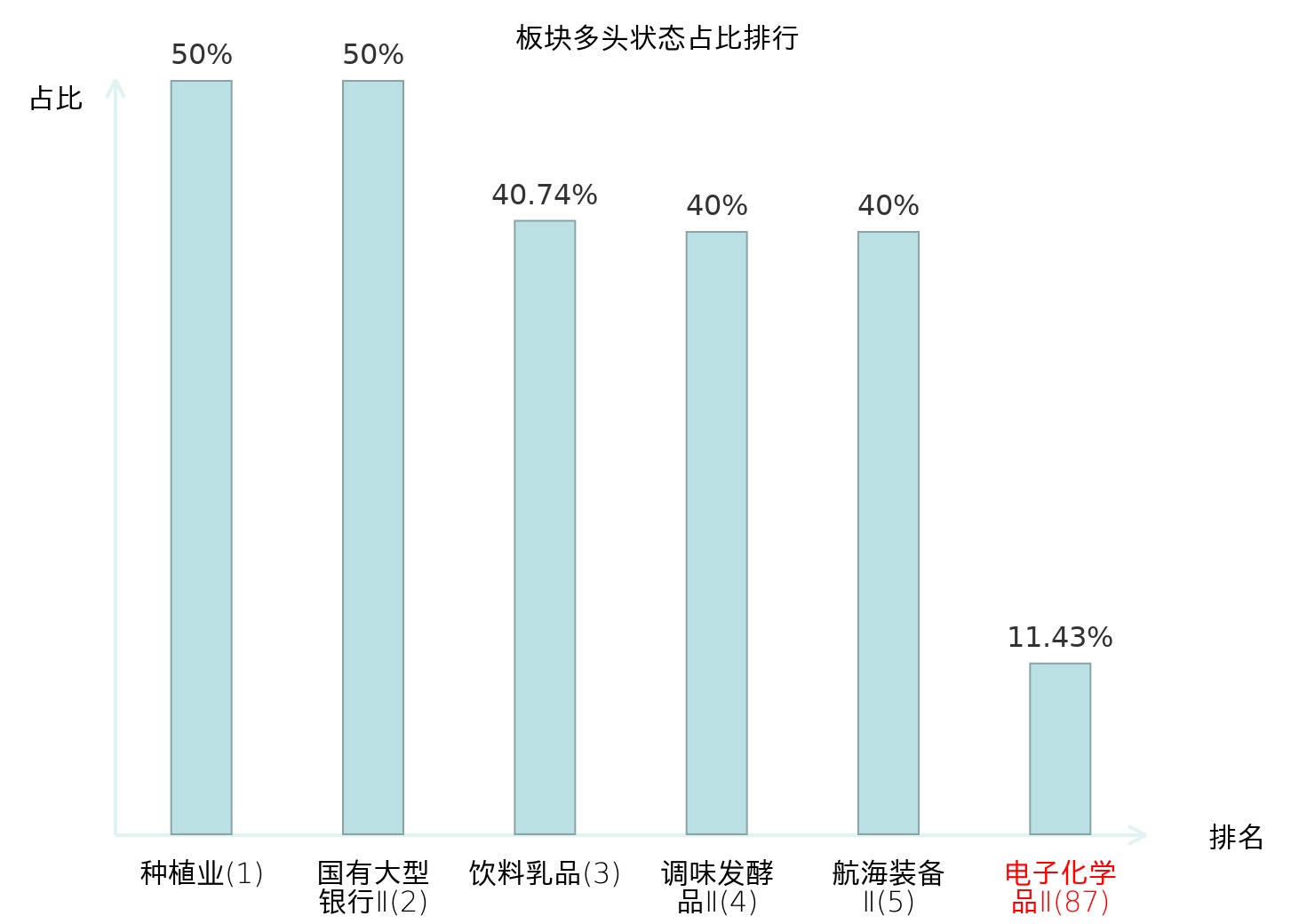 全市场所有行业板块中主力多头状态占比排名中,种植业板块位居第一。冶钢原料板块名次提升最快,较昨日上升89位。