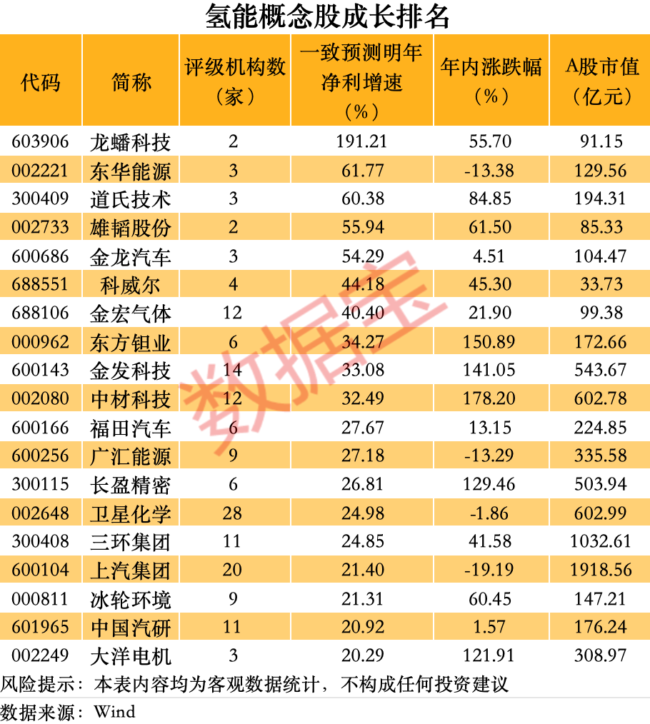从成长性来看,根据机构一致预测,两家机构以上评级个股中,有19只概念股明年净利增速超20%。其中,龙蟠科技增速位居第一,超过191%,东华能源道氏技术雄韬股份等个股增速均超50%。