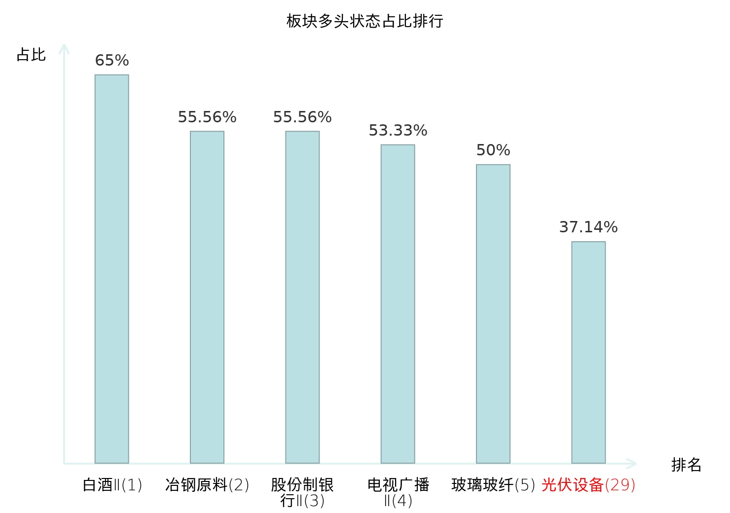 全市场所有行业板块中主力多头状态占比排名中,白酒Ⅱ板块位居第一。白酒Ⅱ板块名次提升最快,较昨日上升71位。