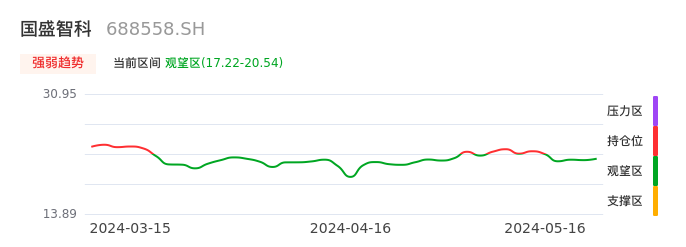 我们来看一下该股的九方特色指标强弱趋势的情况:国盛智科自05月10日从持仓区下穿到观望区。股价近期持续下跌后,短期出现止跌迹象。后续重点关注能否再次站上多空分界点:20.54元。如未能有效突破则可能进入新一轮空头行情。