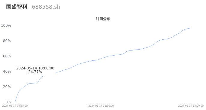 688558国盛智科2024年05月14日成交5729手,成交金额1150.42万元,相较昨日缩量7317手,换手率0.43%,成交清淡。