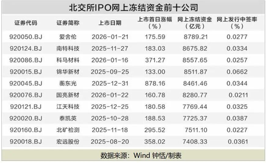 与审核提速相呼应的是,北交所新股发行端也热度爆棚,开年以来上市的科马材料、爱舍伦、国亮新材三只新股,网上冻结资金均超过8000亿元,打新获配比例低至0.02%—0.03%,上市后股价大幅高开,延续了去年以来的赚钱效应。
