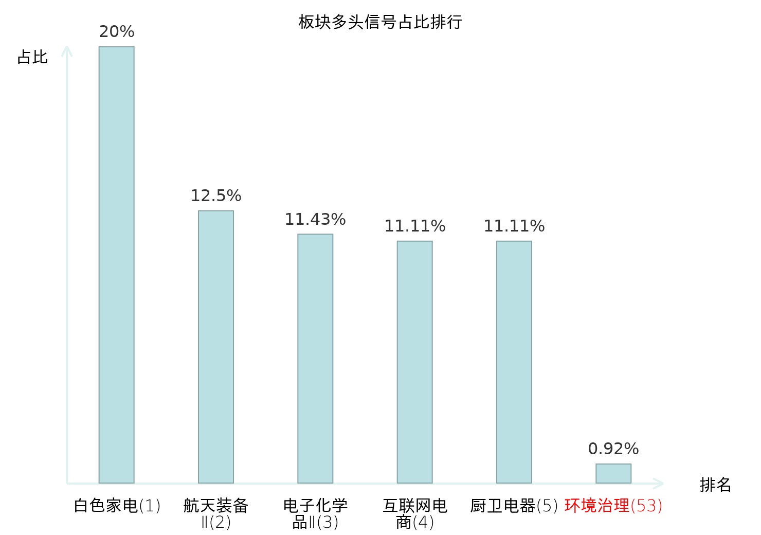 全市场所有行业板块中主力多头信号占比排名中,白色家电板块位居第一。航天装备Ⅱ板块名次提升最快,较昨日上升118位。