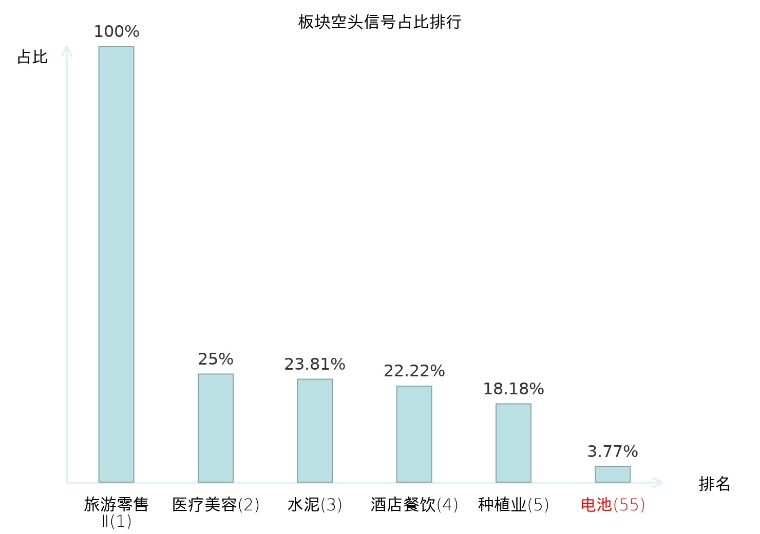 全市场所有行业板块中主力空头信号占比排名中,旅游零售Ⅱ板块位居第一。装修建材板块名次提升最快,较昨日上升112位。