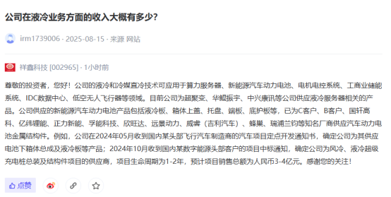 上证报中国证券网讯 祥鑫科技19日在互动平台回答投资者提问时表示,公司的液冷和冷媒直冷技术可应用于算力服务器、新能源汽车动力电池、电机电控系统、工商业储能系统、IDC数据中心、低空无人飞行器等领域。目前公司为超聚变、华鲲振宇、中兴康讯等公司供应液冷服务器相关的产品。公司供应的新能源汽车动力电池产品包括液冷板、箱体上盖、托盘、端板、底护板等,已为C客户、B客户、国轩高科、亿纬锂能、正力新能、孚能科技、欣旺达、远景动力、威睿(吉利汽车)、蜂巢、瑞浦兰钧等知名厂商供应汽车动力电池金属结构件。