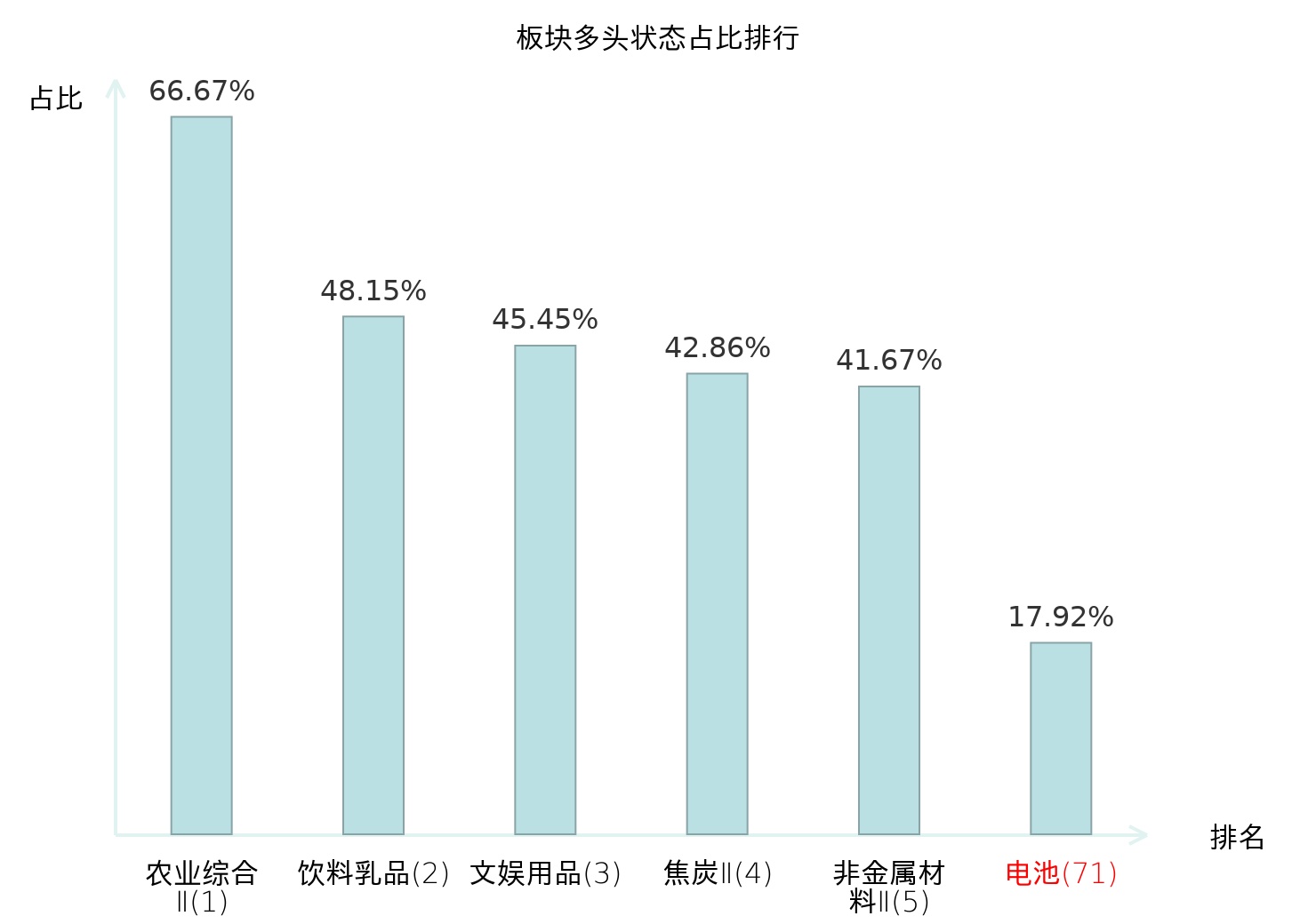 全市场所有行业板块中主力多头状态占比排名中,农业综合Ⅱ板块位居第一。特钢Ⅱ板块名次提升最快,较昨日上升46位。