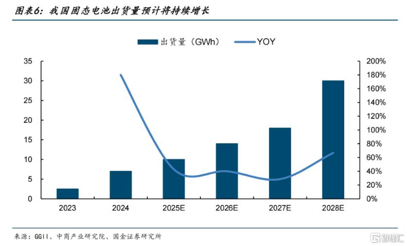根据GGII和中商产业研究院数据,2024年中国固态电池出货量约7GWh,预计2027年将达到18GWh,2028年达到30GWh,2024-2028年期间复合增速为44%。
