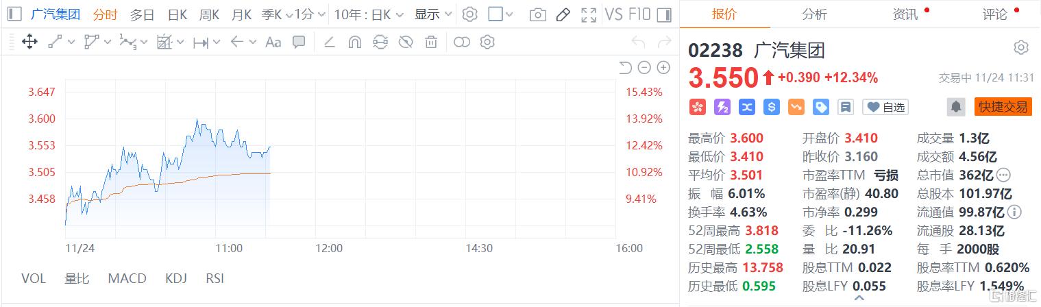 受此消息影响,广汽集团AH股双双大涨,A股一字涨停,H股涨超12%。