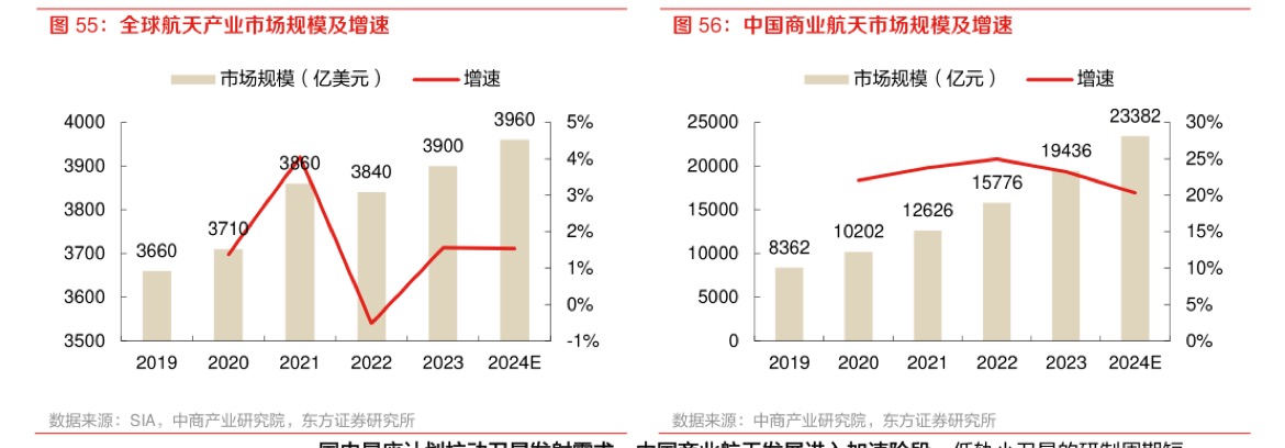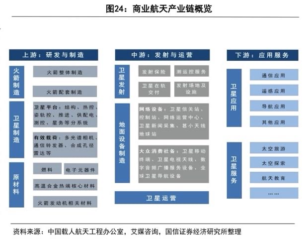 中国卫星(卫星制造) 航天电子(星载遥测) 中天火箭(火箭总装) 航天科技(火箭发射服务) 铂力特(航天零部件)