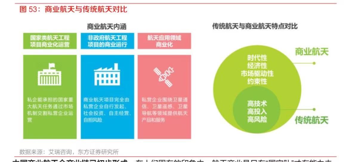 商业航天区别于传统航天,它是以市场化机制运作、以盈利为核心目标,由企业主导投资与风险,为政府及商业用户提供航天产品与服务的航天活动,与军用航天、民用航天并列,覆盖箭星制造、发射、测运控、地面设施及通导遥等全产业链应用!商业航天通过发射服务、星座运营、数据订阅、终端销售等形成可循环的商业闭环,聚焦可回收火箭、微小卫星量产、星上处理等降本增效技术,追求高频次与规模化。
