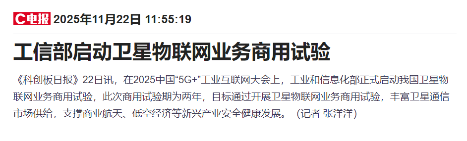 11月22日电,2025中国5G+工业互联网大会22日在武汉开幕。大会期间,工业和信息化部正式启动卫星物联网业务商用试验,商用试验将丰富卫星通信市场供给,支撑商业航天、低空经济等新兴产业安全健康发展,服务构建新发展格局。
