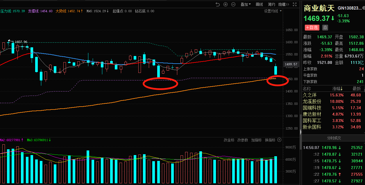商业航天板块指数日K线显示,板块指数上周受大盘拖累下跌,目前回调到紫色支撑虚线和棕色大势线双重支撑位,也是近期箱体下轨平台支撑位置,此平台构成短期重要支撑!