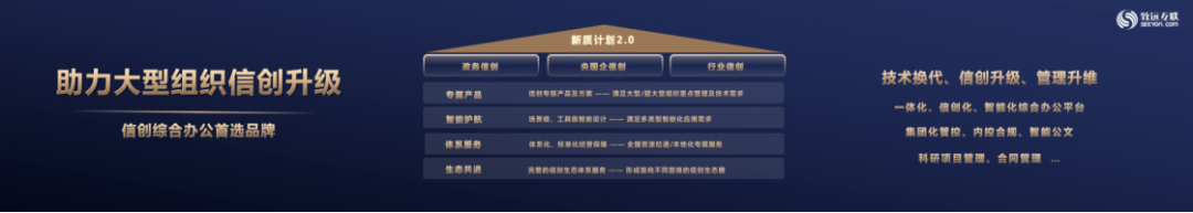 “新质计划1.0”是致远互联面向政务信创、央国企信创、行业信创需求推出的体系服务计划,以AI-COP协同运营平台为底座,依托专属产品、体系服务与生态共建三大策略,加快政企数智化与信创化的融合进程。