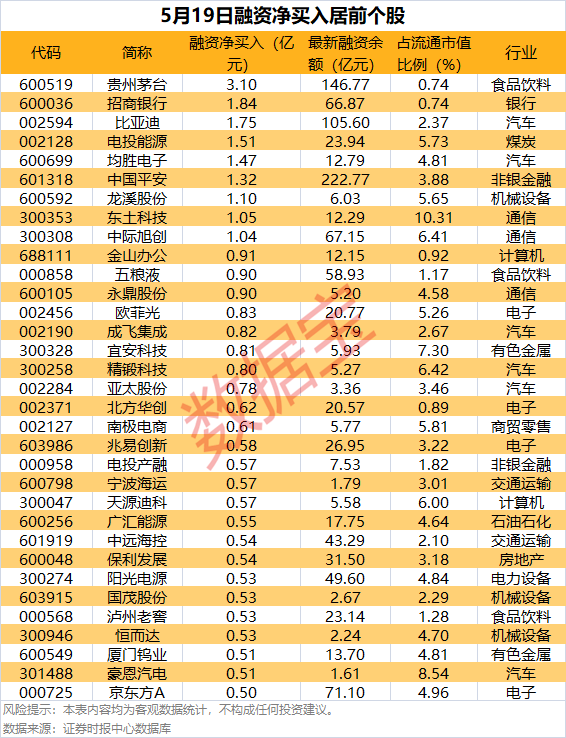 具体到个股,5月19日获融资净买入千万元以上的有315只,其中33只融资净买入额超5000万元。贵州茅台融资净买入额居首,当日净买入3.10亿元;其次是招商银行比亚迪,融资净买入金额分别为1.84亿元、1.75亿元,融资净买入金额居前的还有电投能源均胜电子中国平安等。