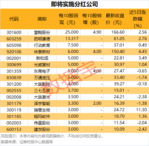 从这些公司的分红方案来看,每10股派现金额在3元(含税,下同)及以上的共有16家,慧翰股份派现最大方,每10股派现25.00元;药明康德行动教育等紧随其后,每10股派现金额分别为13.32元、7.50元。
