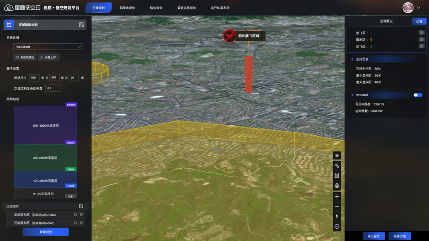 据现场工作人员介绍,启航·低空规划平台根据多种低空应用场景,基于低空应用区域时空数据,实现低空数字底座的快速建立、低空空域划设智能分析、起降场智能设置、航路智能规划等各类低空网联设施智能布设,并可进行低空流量、运力仿真分析,作为后续产业开展实施的数字基础。