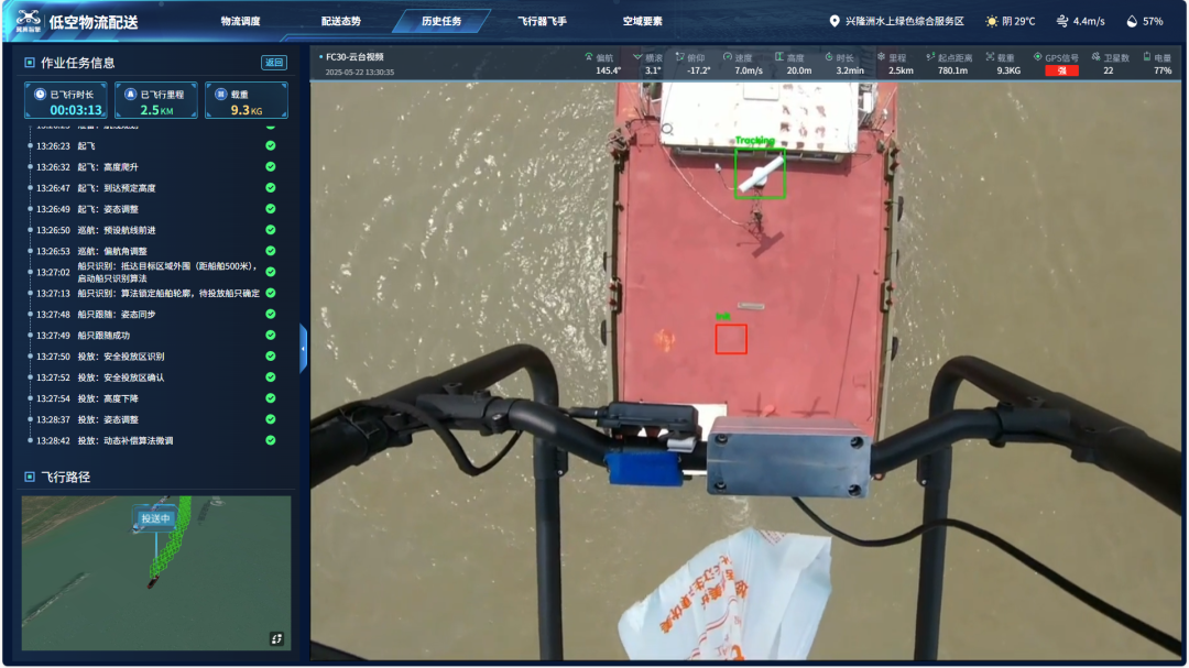 翼算智擎·低空物流应用平台深度聚焦水上物流、乡村物流、跨城物流等特殊场景,以“人-机-空-管-物”五位一体架构构建低空物流配送管理服务体系,突破传统地面交通的时空局限与复杂地形制约,通过嵌入式高算力机载设备与云端智能系统的协同联动,将特征识别、目标跟踪、动态路径规划等核心技术深度融合至无人机作业全流程,实现对高速运动目标的精准定位跟随与动态场景下的稳定投送。