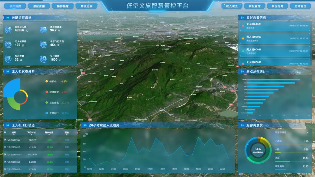 低空文旅智慧管控平台则通过“低空+科技+文化”的融合创新,构建多维度立体化的旅游场景。突破传统地面游览的平面限制,借助空中视角为游客提供全景俯瞰、沉浸式VR/AR交互、动态航拍等特色服务,为游客打造高效便捷、视角独特、创新创意的旅游体验,提升游客的情感价值,推动旅游产业的创新升级。