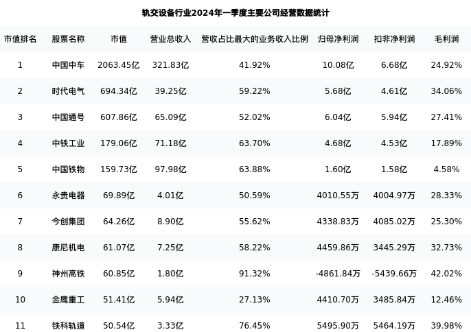 铁科轨道最新报告期数据为一季度,下表汇总了轨交设备行业内市值靠前的公司一季度主要经营数据