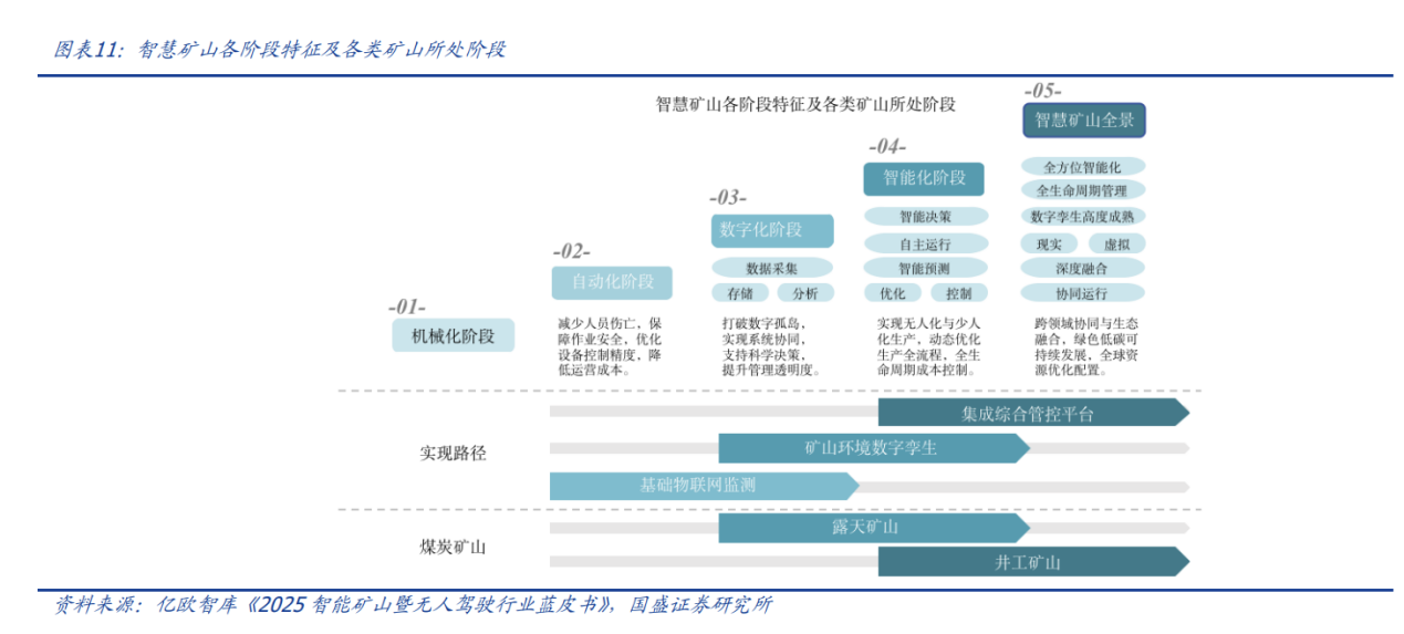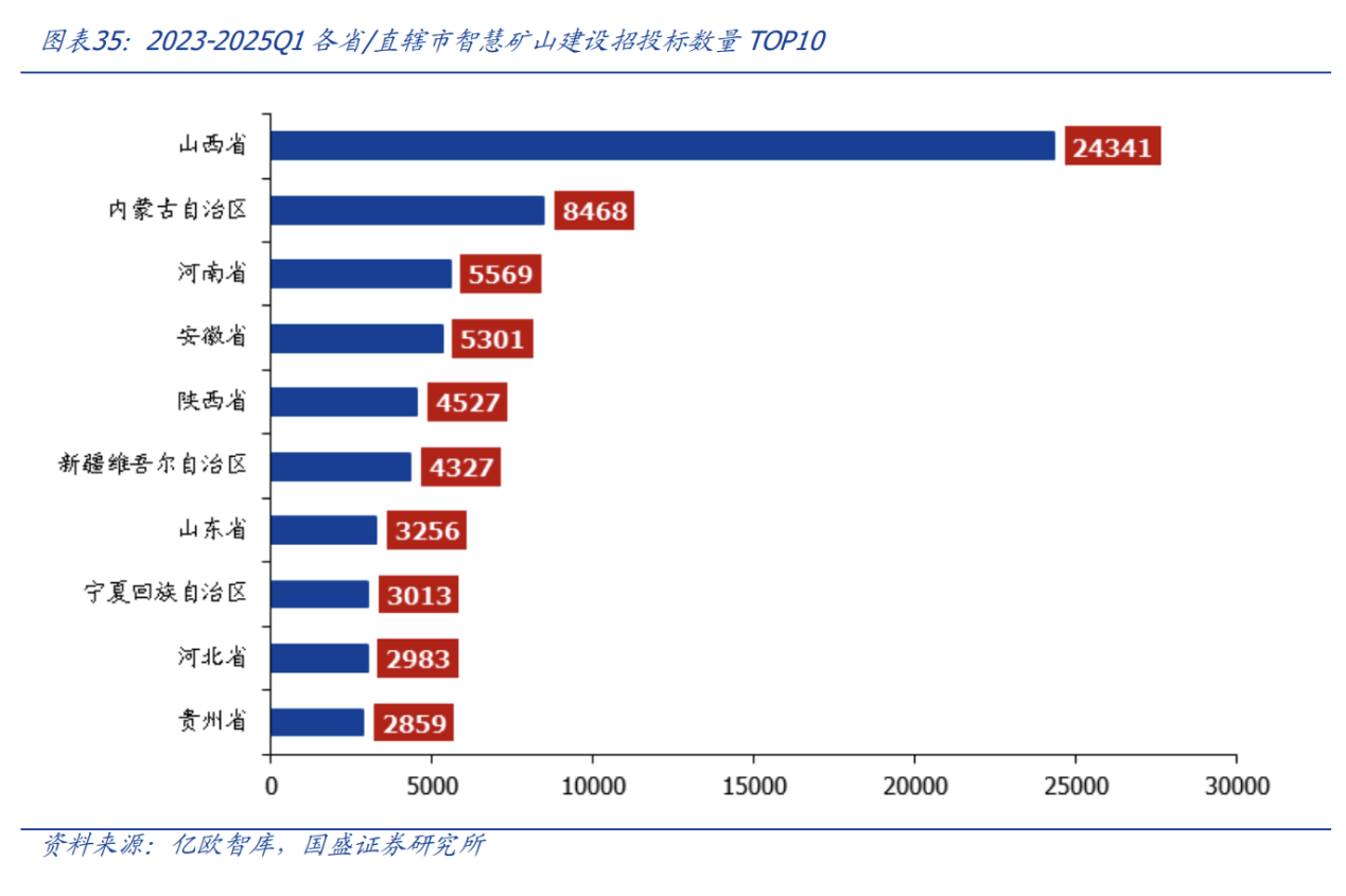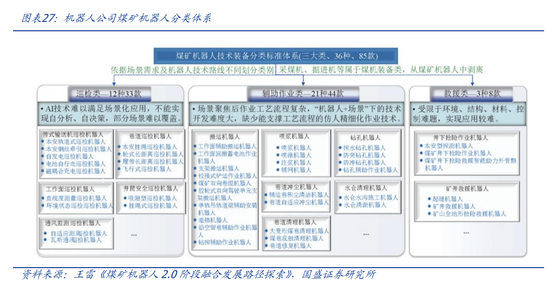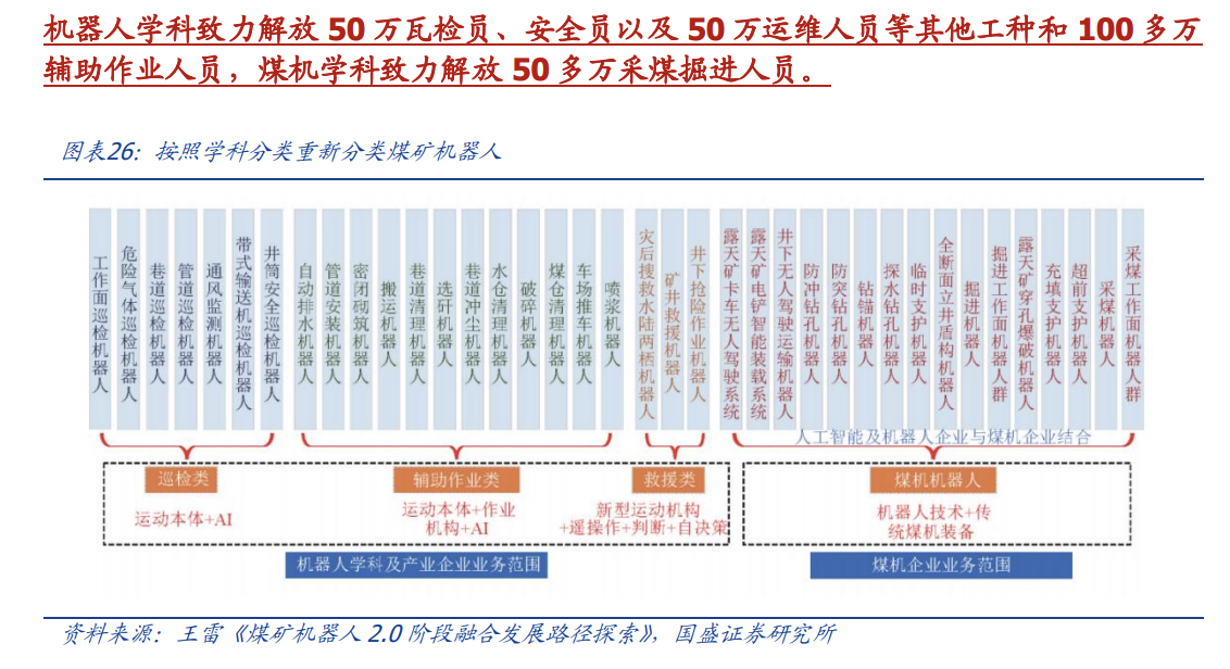 矿山机器人:千亿市场或仅仅只是起步。参考中煤科工首席科学家、中煤科工机器人创始人王雷测算观点,目前全国共有4300个煤矿,90%井工煤矿,每个井工煤矿平均有10~20个巷道。保守来算若每个巷道10台巡检机器人,全国约40万台巡检机器人需求,目前煤矿巡检机器人单价约100万元以上,这意味着仅仅巷道巡检场景,也至少是千亿级的市场。而上述测算还仅仅是其中的一个类别,根据2025年9月国家矿山安监局最新发布的《矿山智能机器人重点研发目录》,煤矿机器人共涉及7大类,56种智能机器人。畅想未来,随着以“具身智能”为引领的技术革命取得重大突破,在深达数百米、环境复杂严酷的煤矿井下,机器人不仅能自主巡检/运输、精准作业,甚至能在灾后自主执行救援任务,而煤机的具身智能化亦解放了采煤、掘进等一线工人。这并非科幻场景,而是煤矿机器人“具身智能”技术正在加速实现的未来。