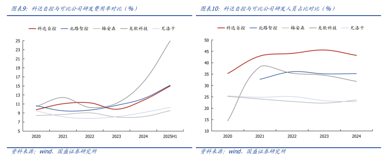 高度重视研发,为长期创新赋能。从研发团队来看,科达自控研发人员占比高。2024年,公司研发人员总数为278人,占员工总量的比例为43.2%,其中博士1人(2023年0人)、硕士29人(2023年26人);相比之下可比公司2024年研发人员占比仅28.3%。从研发支出来看,2024年,科达自控的研发支出金额为5124万元,占营业收入的比例为11.81%,相比之下可比公司2024年研发费用支出占比11.3%。2024年,公司共拥有171项专利,其中56项为发明专利。相比2023年的152项专利和30项发明专利,专利数量显著增长。