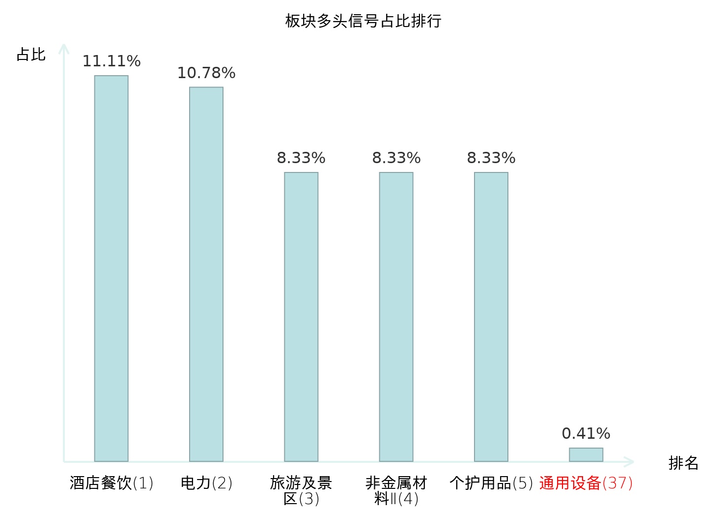 全市场所有行业板块中主力多头信号占比排名中,酒店餐饮板块位居第一。航运港口板块名次提升最快,较昨日上升87位。