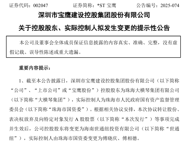 根据相关协议安排,本次协议转让股份、表决权放弃及向特定对象发行A股股票等事项完成并生效后,公司控股股东变更为世通纽,实际控制人变更为傅晓庆、傅相德。公司股票自10月27日开市起复牌。