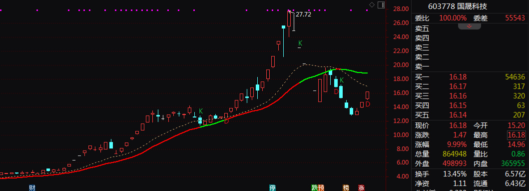 近两日的股价异动并非国晟科技近期首次出现行情,在去年10月15日至今年1月14日,国晟科技暴涨超670%,在随后的半个月里国晟科技又暴跌54%,股价走上过山车。截至今日收盘,国晟科技市值106亿元,较10月15日股价上涨前提升350%。