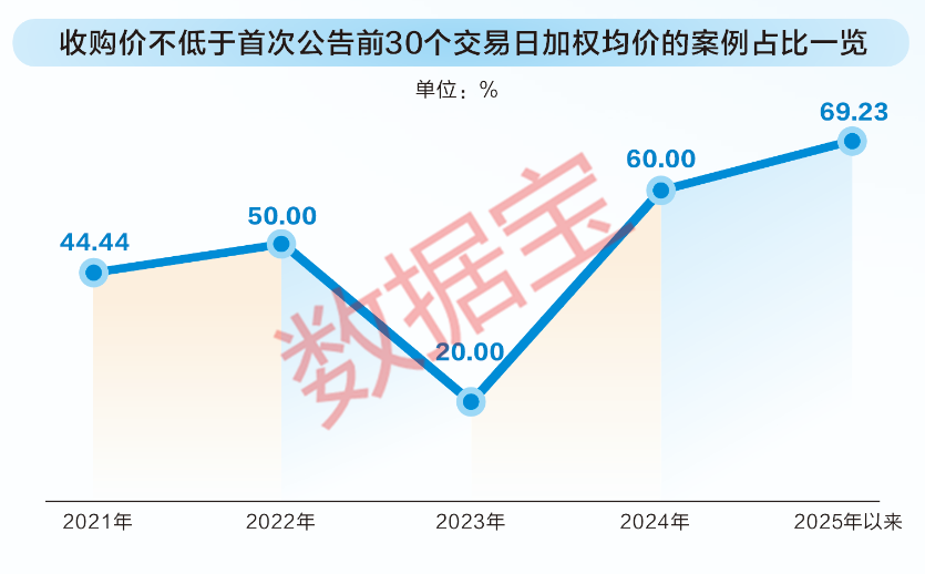 最后,对中小股东保护意识强化。近年来,监管层对要约价格的合规性监管趋严。以今年以来上市公司作为目标方的案例来看,要约价格较首次公告日前30个交易日的加权均价存在溢价的案例数量占比近七成,占比创2021年以来新高,平均溢价率超过7%,为2021年以来次新高。
