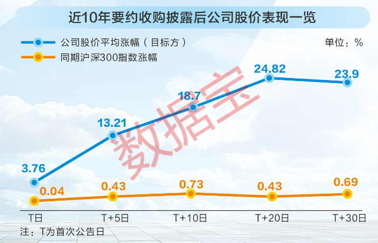以上市公司作为目标方的收购案例为统计对象,以要约收购首次公告日为基准日(T日),对T日、T+5日、T+10日、T+20日及T+30日的5个时间段的涨跌幅均值进行分析,并对比同期沪深300指数的涨跌幅。