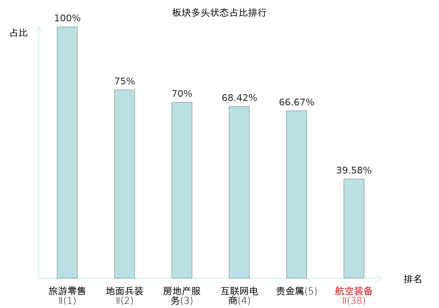 全市场所有行业板块中主力多头状态占比排名中,旅游零售Ⅱ板块位居第一。白色家电板块名次提升最快,较昨日上升65位。