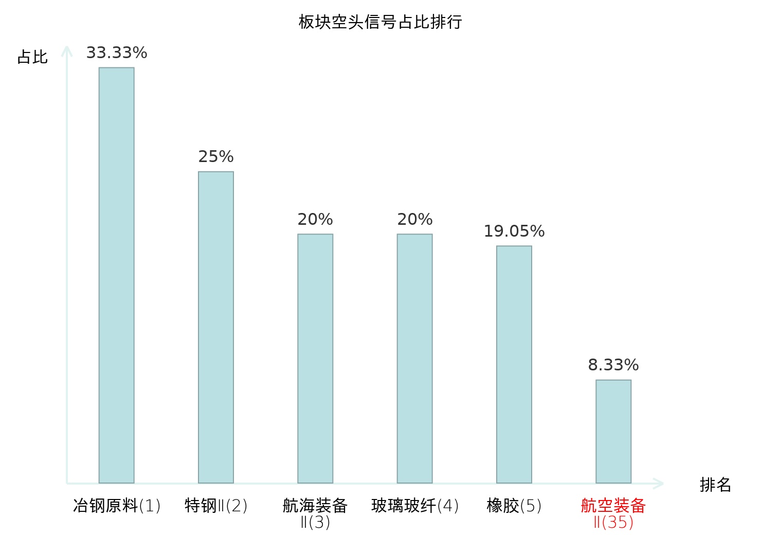 全市场所有行业板块中主力空头信号占比排名中,冶钢原料板块位居第一。军工电子Ⅱ板块名次提升最快,较昨日上升98位。