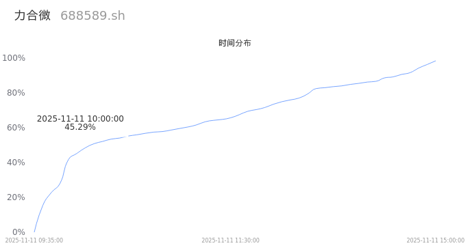 688589力合微2025年11月11日成交3.87万手,成交金额9110.95万,相较昨日缩量3604手,换手率2.67%,成交清淡。