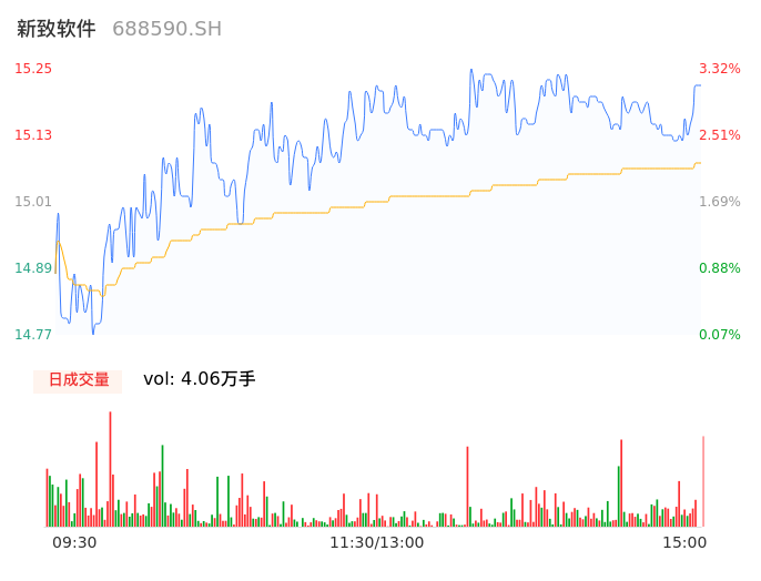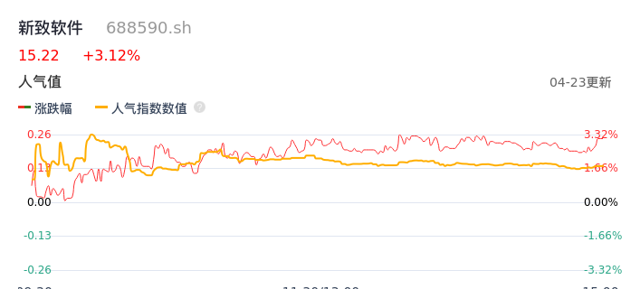 04月23日,新致软件收报15.22,股价涨幅3.12%,成交金额6114.30万元,换手率1.56%。