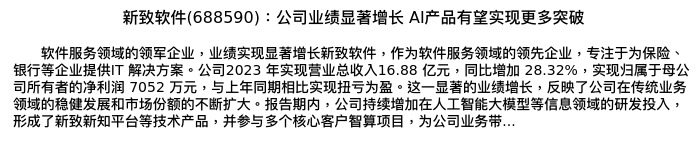 值得注意的是:2024年03月华鑫证券的任春阳/宝幼琛分析师,首次发布关于新致软件的研究报告,标题为:新致软件(688590):公司业绩显著增长 AI产品有望实现更多突破。