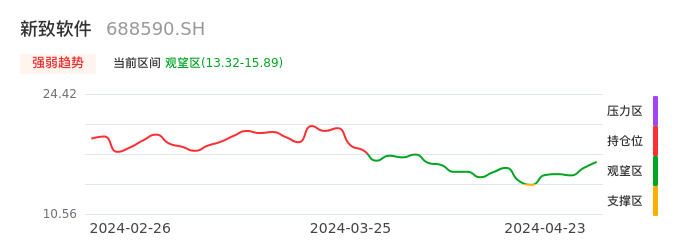 我们来看一下该股的九方特色指标强弱趋势的情况:新致软件自04月17日从支撑区回到观望区。股价前期快速下跌后经过中途弱势整理。目前短期处于弱势反弹迹象,后续重点关注能否站上多空分界点:15.89元。如未能有效突破则说明弱势反弹行情结束。后续可能再次进入空头行情。