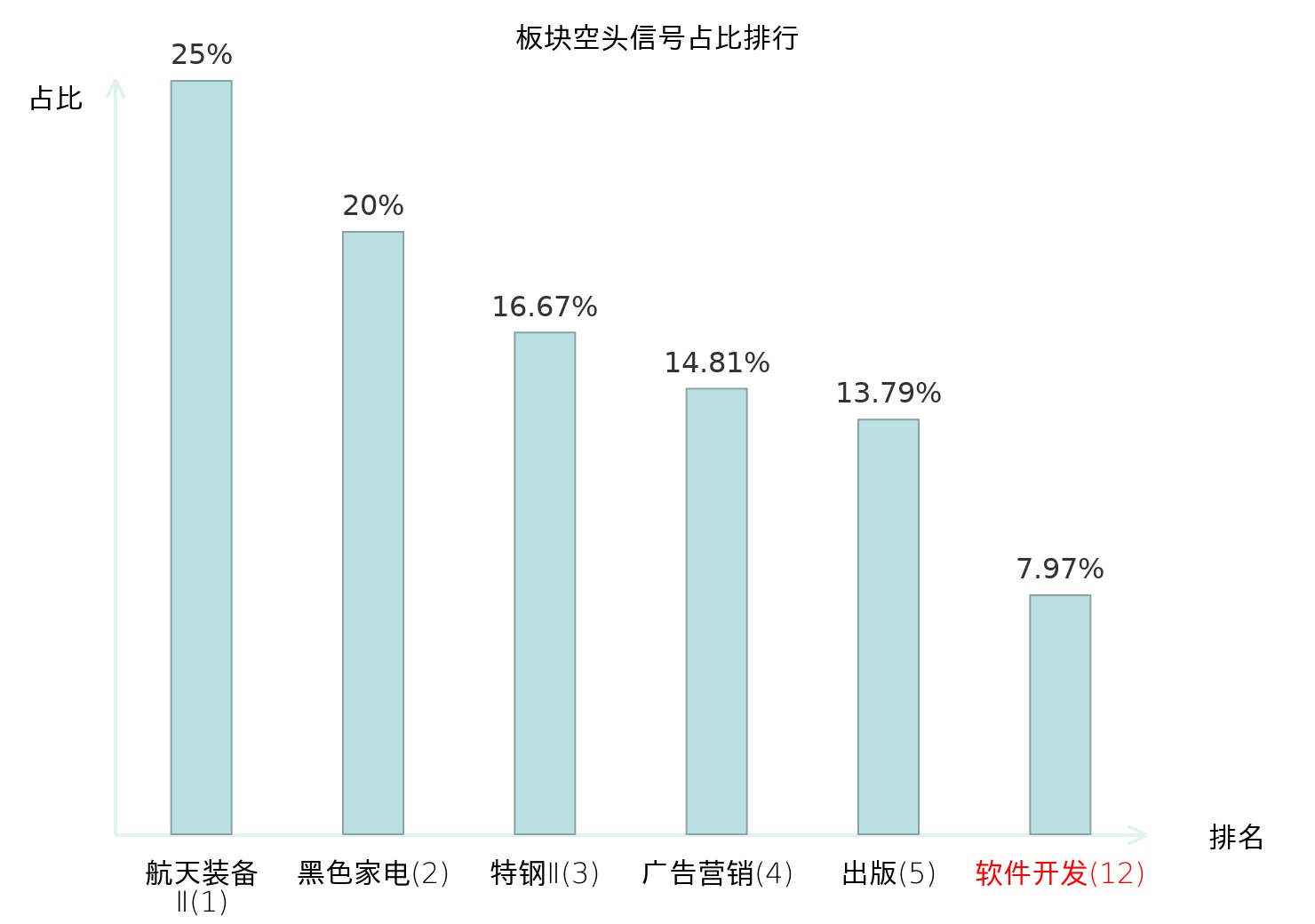 全市场所有行业板块中主力空头信号占比排名中,航天装备Ⅱ板块位居第一。软件开发板块名次提升最快,较昨日上升119位。