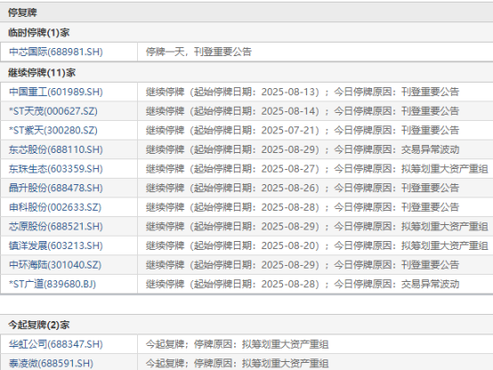 上证报中国证券网讯 9月1日,1家公司临停:中芯国际,2家公司复牌:华虹公司、泰凌微。