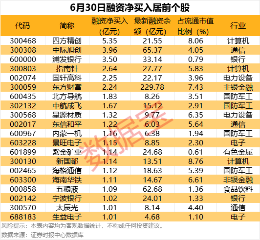 具体到个股,6月30日获融资净买入千万元以上的有538只,其中20只融资净买入额超1亿元。四方精创融资净买入额居首,当日净买入5.35亿元;其次是中际旭创、浦发银行,融资净买入金额分别为3.96亿元、3.50亿元;融资净买入金额居前的还有指南针、国轩高科、东方财富等。